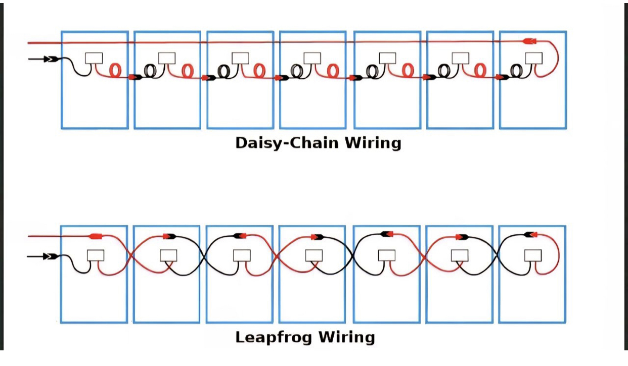 در سیستمهای_انرژی_خورشیدی، به خصوص هنگام اتصال چندین پنل خورشیدی یا میکرواینورترها، دو روش سیمکشی رایج، پیکربندیهای زنجیرهای (daisy chain) و جهشی (leapfrog) هستند. هر دو روش برای اتصال پنلها در یک سیستم استفاده میشوند، اما از نظر راندمان، طول سیمکشی و افت_ولتاژ با هم تفاوت دارند.