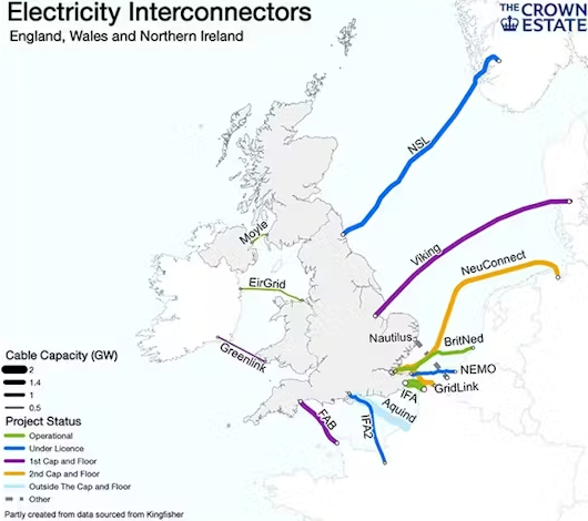 در سال 2021، 14 تراوات ساعت (TWh) واردات خالص از فرانسه وجود داشت در حالی که در سال 2022، 10 تراوات ساعت به فرانسه وارد شد. این یک نوسان عظیم 24 تراوات ساعت از یک نقطه اتصال است و نشاندهنده بزرگترین تغییر سالانه در یک منبع برق واحد از زمان تغییر از زغال سنگ به گاز در سالهای 2015/16 است. برای در نظر گرفتن 24 تراوات ساعت، این تقریباً مشابه میزان برق مصرفی سالانه اسکاتلند یا تولید سالانه تولید باد خشکی بریتانیا است.