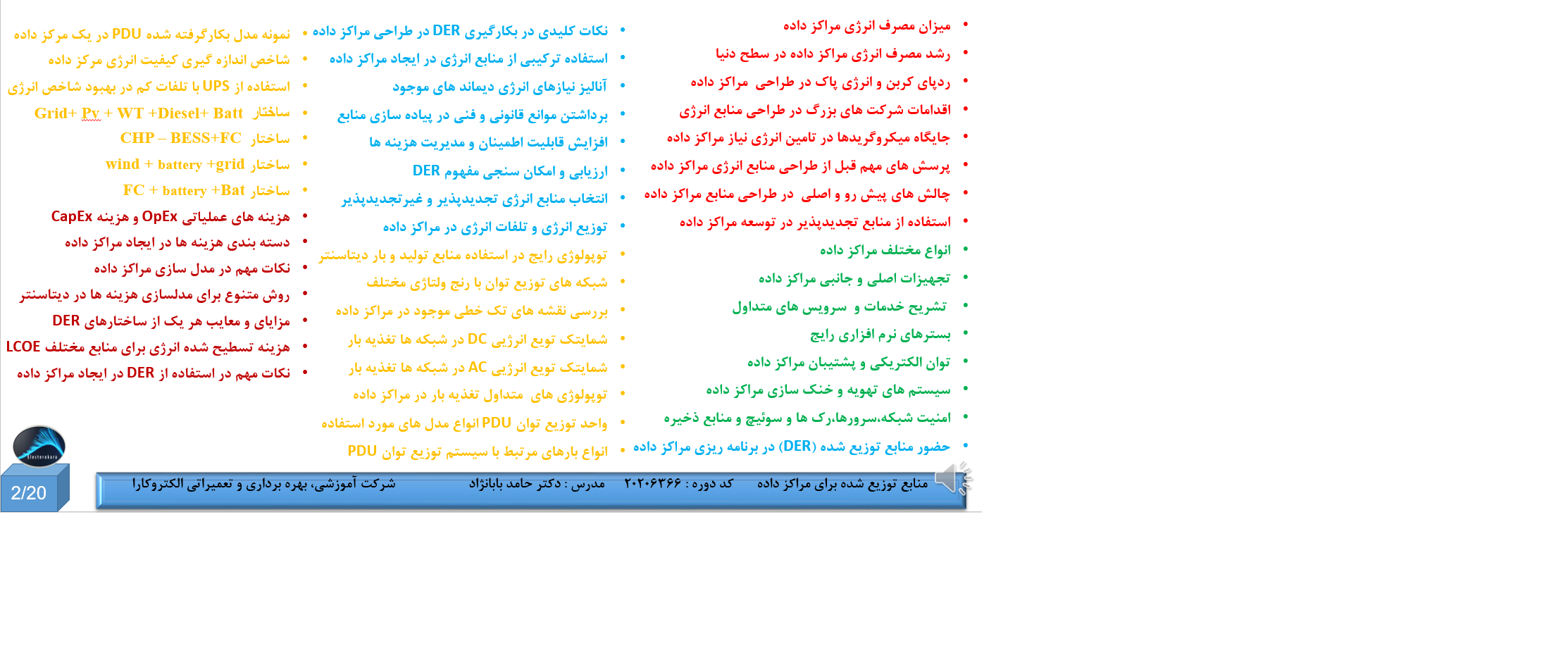 انتظار میرود بازار دیتاسنترها تا سال 2034 به حدود 775.73 میلیارد دلار برسد،که این مقدار سالانه11.72 درصد از سال 2024 تا 2034 افزایش خواهد یافت. با رشد منابع انرژی به همان مقدار نیاز به تامین انرژی برای این مراکز بیشتر از قبل خواهد بود. این دوره بعنوان اولین دوره منابع انرژی توزیع شده (DER) برای مراکز داده در سطح کشور بمنظور تشریح چگونگی برق رسانی دیتاسنتر ها توسط منابع انرژی توزیع شده با محوریت انرژی پاک ارائه میگردد. این دوره در 5 فصل با سرفصل های که در تصویر دوره آمده به تمامی جزئیات اهم از چالش ها،پرسش ها و دغدغه های قبل از طراحی منابع انرژی برای مراکز داده ، ساختار های رایج DCو AC ، چگونگی برق رسانی به بار، چگونگی کاهش هزینه ها و بهره وری انرژی در مراکز داده و انواع مدل های رایج شبکه های انرژی توزیع شده شامل انرژی خورشیدی، توربین های بادی،پیل سوختی، دیزل و شبکه اصلی برق، انواع مدل های بکارگیری UPS ،PDU و انواع بارهای مورد استفاده،بررسی هزینه های رایج در دیتاسنترها، تشریح خدمات و سرویس های رایج در مراکز داده،چگونگی استفاده از روش های هایبرید تامین انرژی در دیتاسنتر پرداخته میشود.